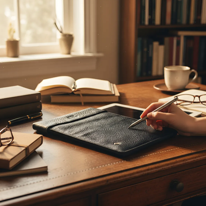 Προστατέψτε το iPad/tablet σας με στυλ και ποιότητα με τη θήκη iPad/tablet από B|A|B Leather Goods. Φτιαγμένη με Γνήσιο Δέρμα Oλικής άλεσης, αυτή η θήκη προσφέρει ανθεκτική και κομψή προστασία για το iPad/tablet σας. Το Γνήσιο Δέρμα και Tσόχα εγγυώνται βέλτιστη προστασία από χτυπήματα και γρατσουνιές.