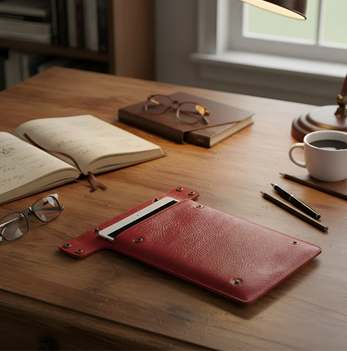 ΣΥΝΘΕΣΗ: Θήκη για iPad/tablet κατασκευασμένη από Ολόσωμο Γνήσιο Δέρμα Oλικής άλεσης. Χρώματα: Μπλε Γνήσιο Δέρμα / Κόκκινο Γνήσιο Δέρμα / Μαύρο Γνήσιο Δέρμα. Εσωτερικό από Tσόχα για προστασία του iPad/tablet από χτυπήματα και γρατσουνιές. 8 Snaps για να κλείσετε τη θήκη, τοποθετήστε το iPad/tablet στις 45 μοίρες και μεταμορφώστε το σε (Clutch).