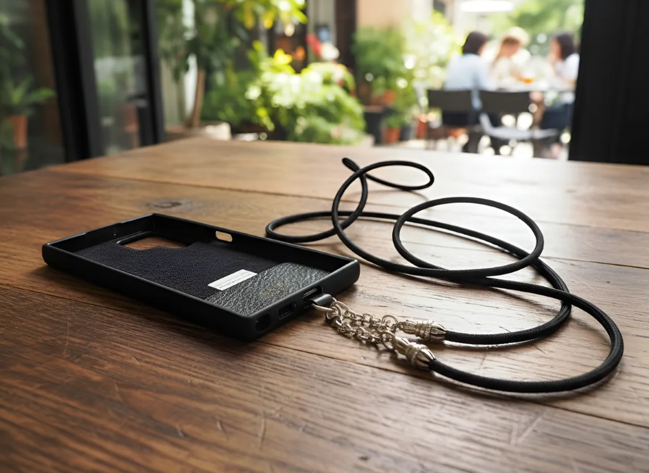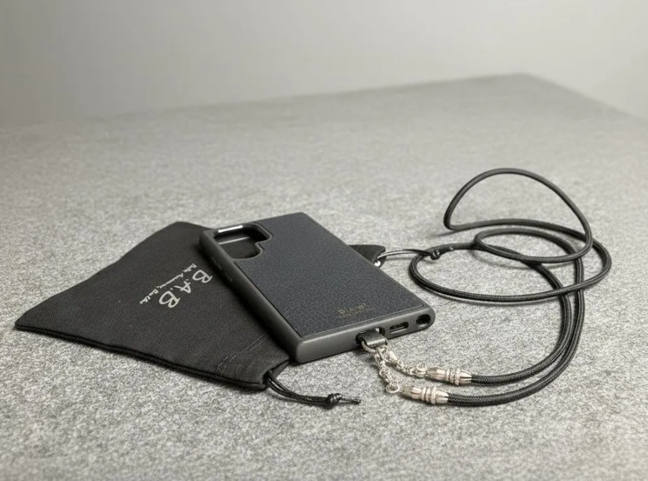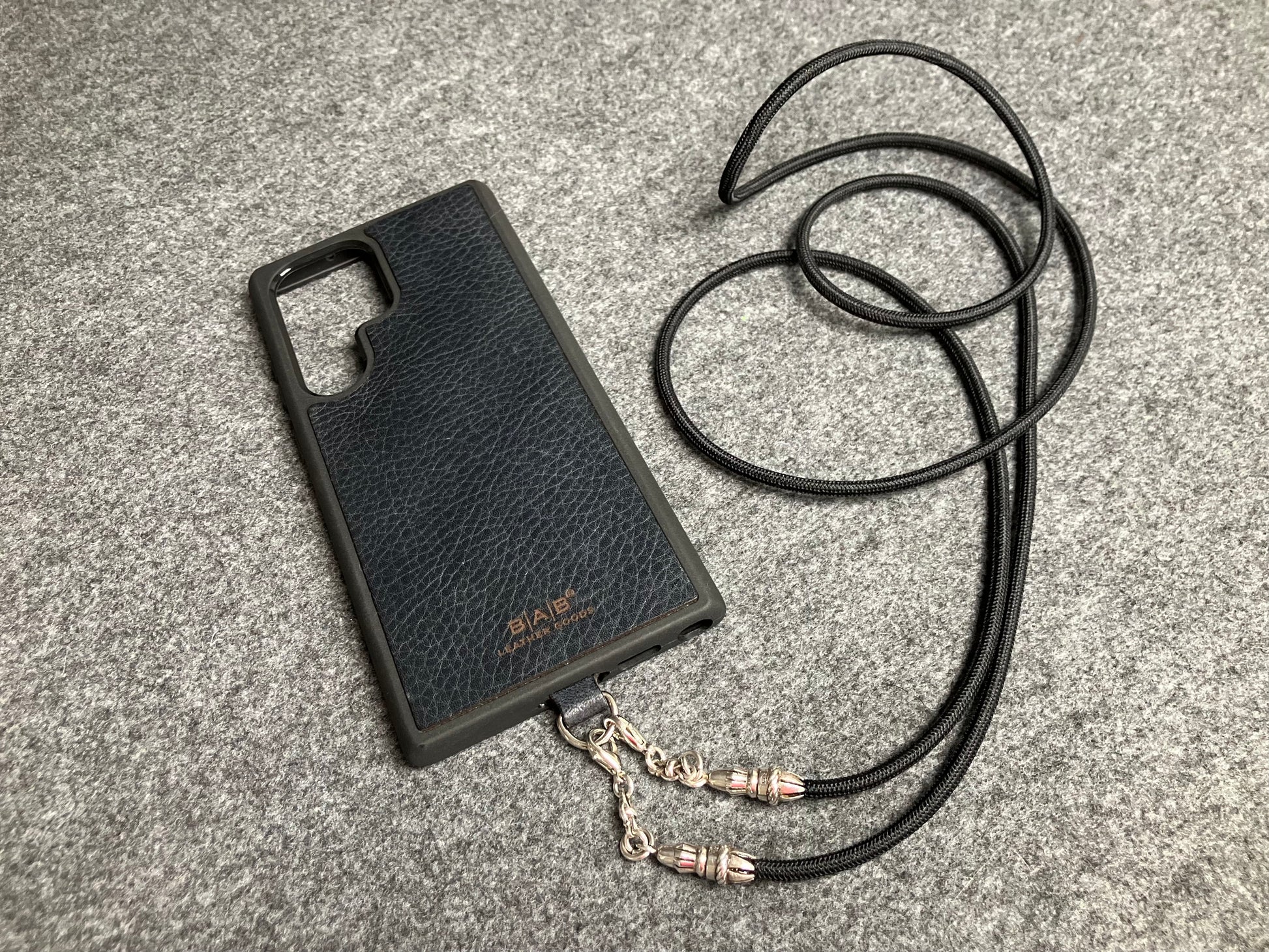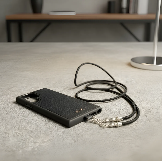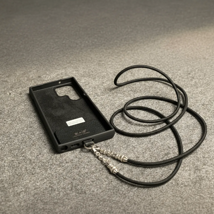 Kit Funda/Soporte de Cuero Genuino Full-Grain curtido vegetal al tanino para Samsung cortados y grabados con láser, TPU reforzado & Crossbody/Collar/Gargantilla/Pulsera de Cuerda Elástica Negra & Plata Esterlina 925.