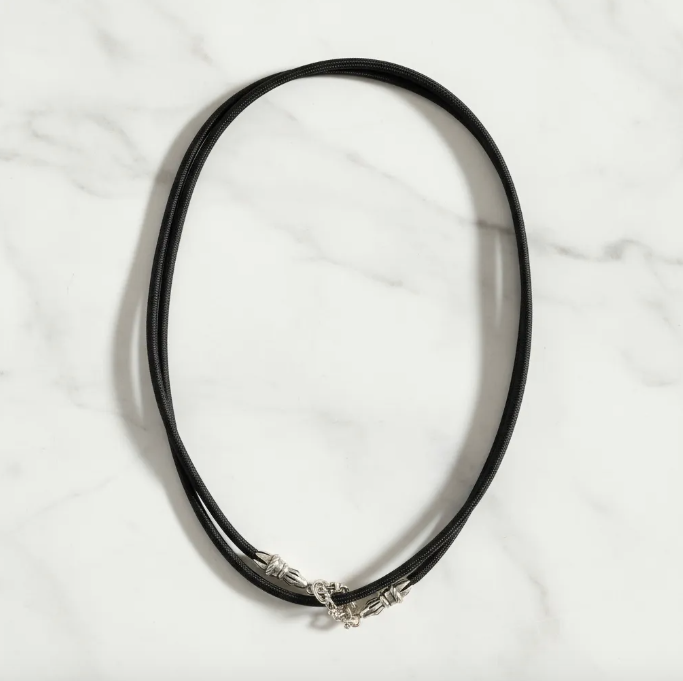 Descubre la elegancia y sofisticación de este lujoso Crossbody/Collar/Gargantilla/Pulsera de Plata Esterlina 925 y Cuerda Elástica. Con un acabado pulido y espesor de 0,4 cm, este accesorio es perfecto para aquellos que buscan resaltar su estilo. Producido con Plata Esterlina 925 maciza y un Crossbody/Collar/Gargantilla/Pulsera de Cuerda Elástica Negra, otorga un diseño versátil y cómodo de usar.
