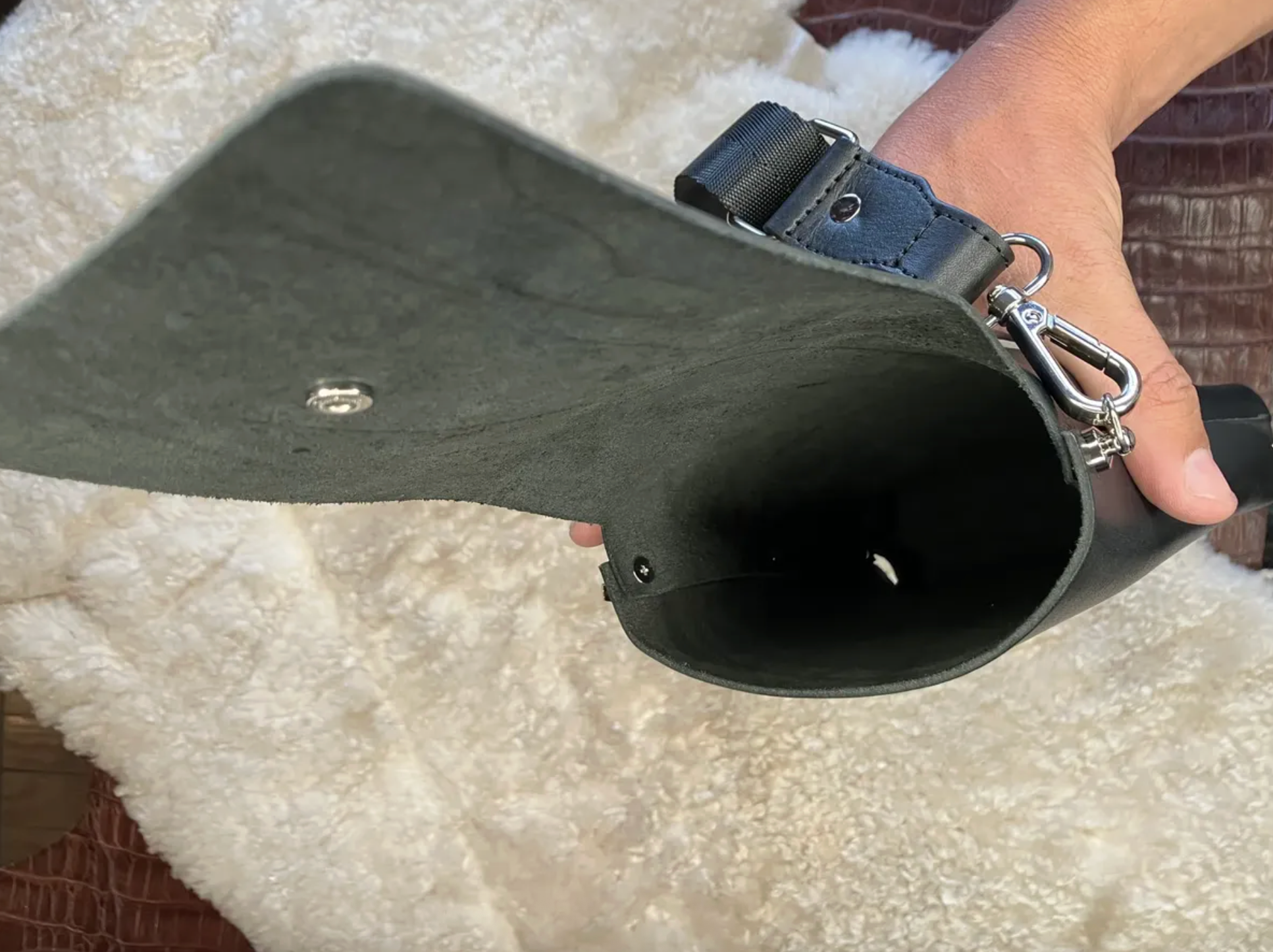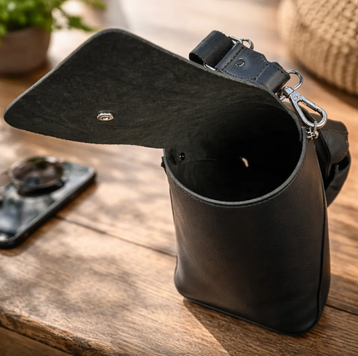 COMPOSICIÓN/LISTO PARA ENVIAR: Bandolera/Portacelular de Cuero Genuino Vaqueta curtido vegetal al tanino para proteger los celulares de golpes y rayones. Colores: Negro/Suela. 1 Correa Negra de mt 1,30 de largo y 3 cm de ancho, 2 Mosquetones Giratorios, 2 Clavos, 1 Dado, 1 Deslizador, 7 Remaches y 1 Broche resorte para cerrar la Bandolera/Portacelular, los 14 plateados.