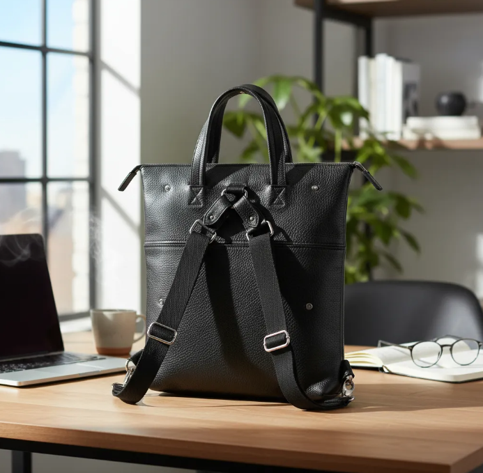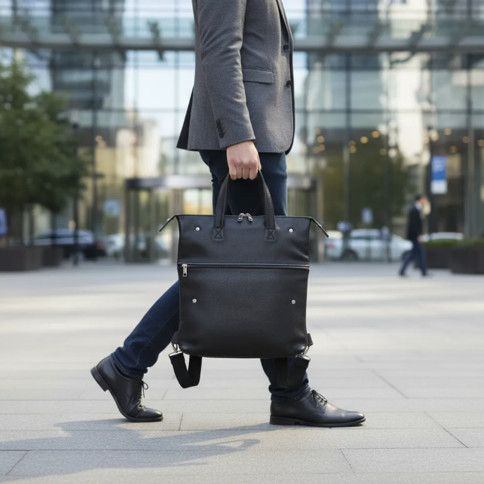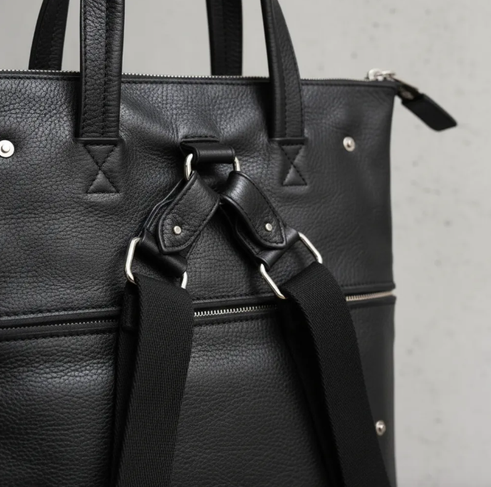 COMPOSIÇÃO: Mochila/Tote/Carteira/Portfólio feita de Couro Genuíno Preto Flor Integral curtido vegetal com tanino. Interior totalmente forrado com Feltro para proteger os dispositivos eletrônicos contra choques e arranhões. 2 Bolsos externos com fecho YKK e 2 puxadores com Pingente Estrela de Bronze prateado. 2 Botões de pressão para converter a Mochila em Portfólio. 1 Bolso interno duplo para colocar carregador e cabos. 2 Tiras externas de polipropileno. 2 Mosquetões, 2 Reguladores, 2 Dados, 2 Abotoaduras e 5 Meia-luas para fixação das correias. Fecho externo YKK e puxador com Pingente Estrela de Bronze prateado para fechar a Mochila.