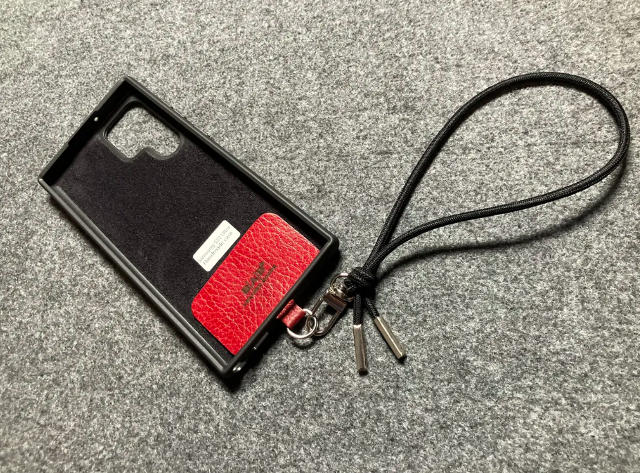 COMPOSIÇÃO: Capa e Suporte para Samsung feitos de Couro Flor Integral curtido vegetal com tanino cortados e gravados a laser. Cores Couro Genuíno Azul / Couro Genuíno Vermelho / Couro Genuíno Preto. Correia/Pulseira de Corda Elástica Preta. O Interior de microfibra cortado e gravado a laser protege o Samsung contra choques e arranhões. 1 Mosquetão giratório para evitar enroscos, 2 Terminais e 1 Meia-lua, todos prateados.